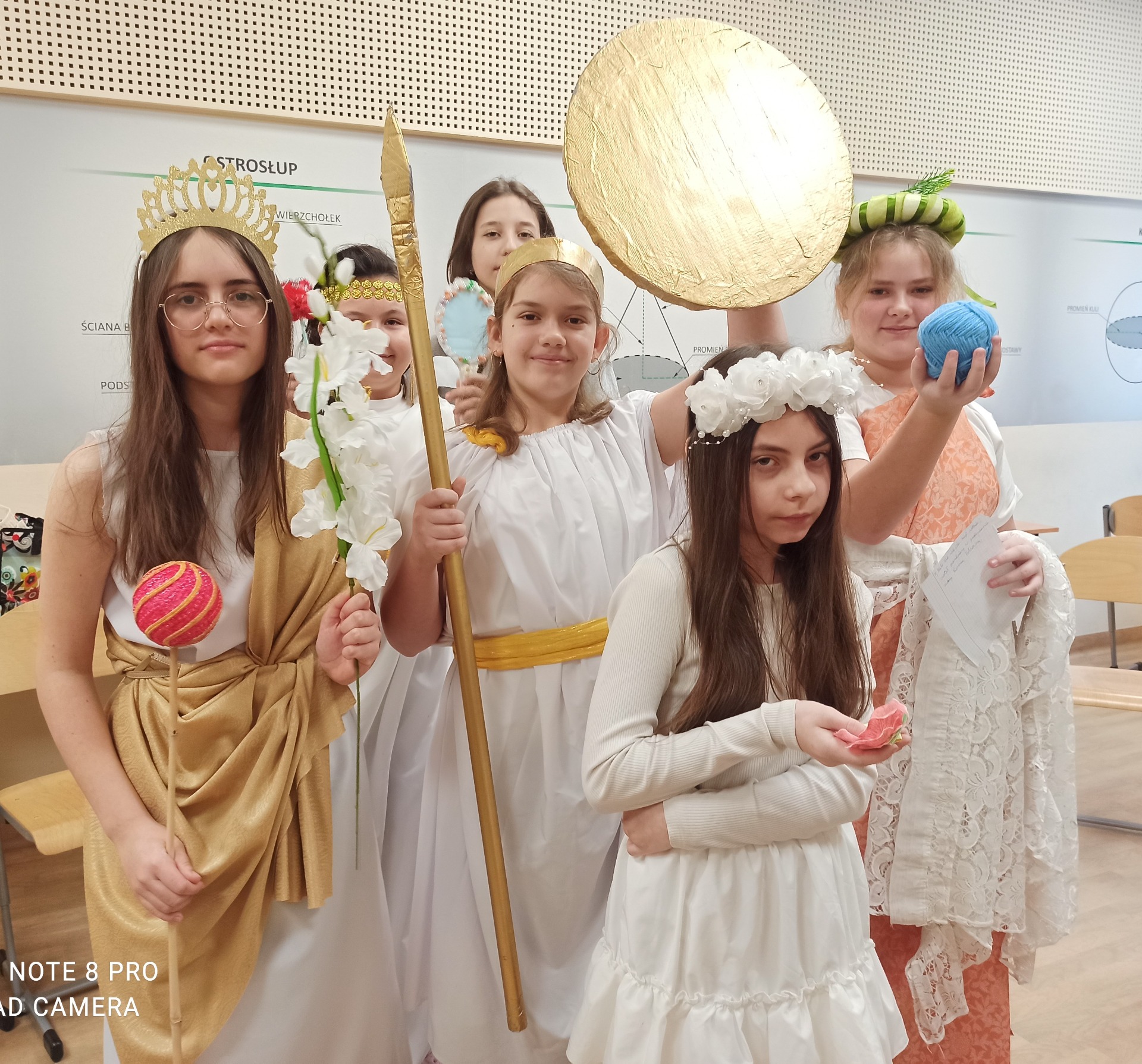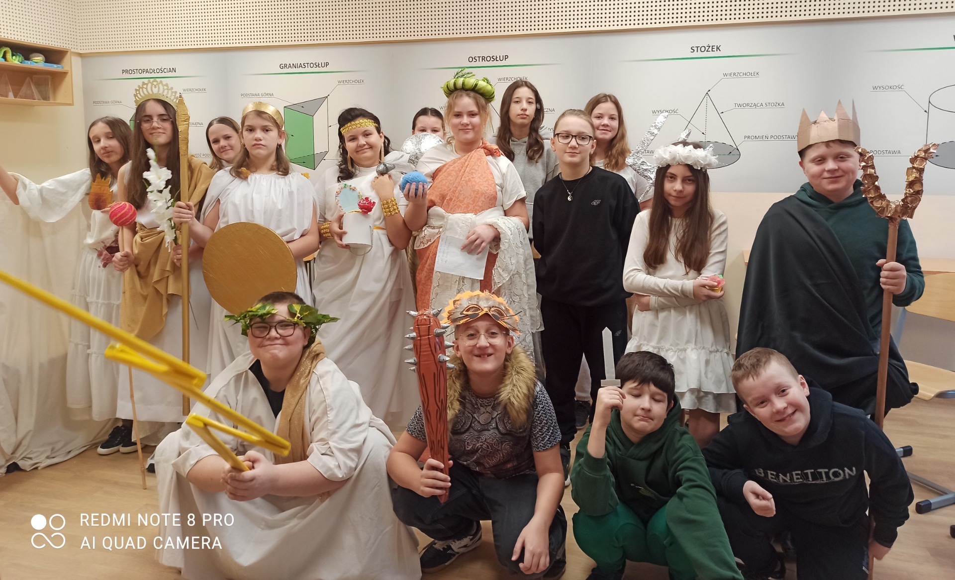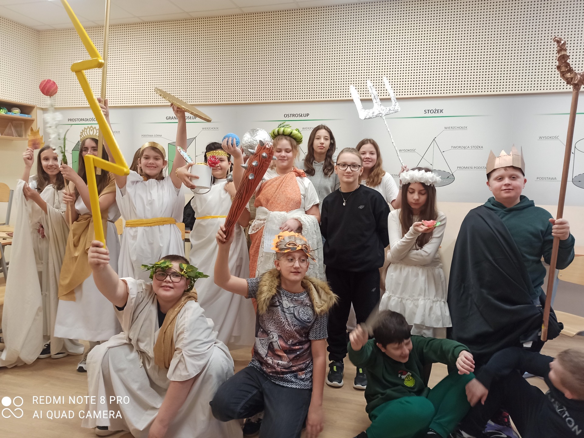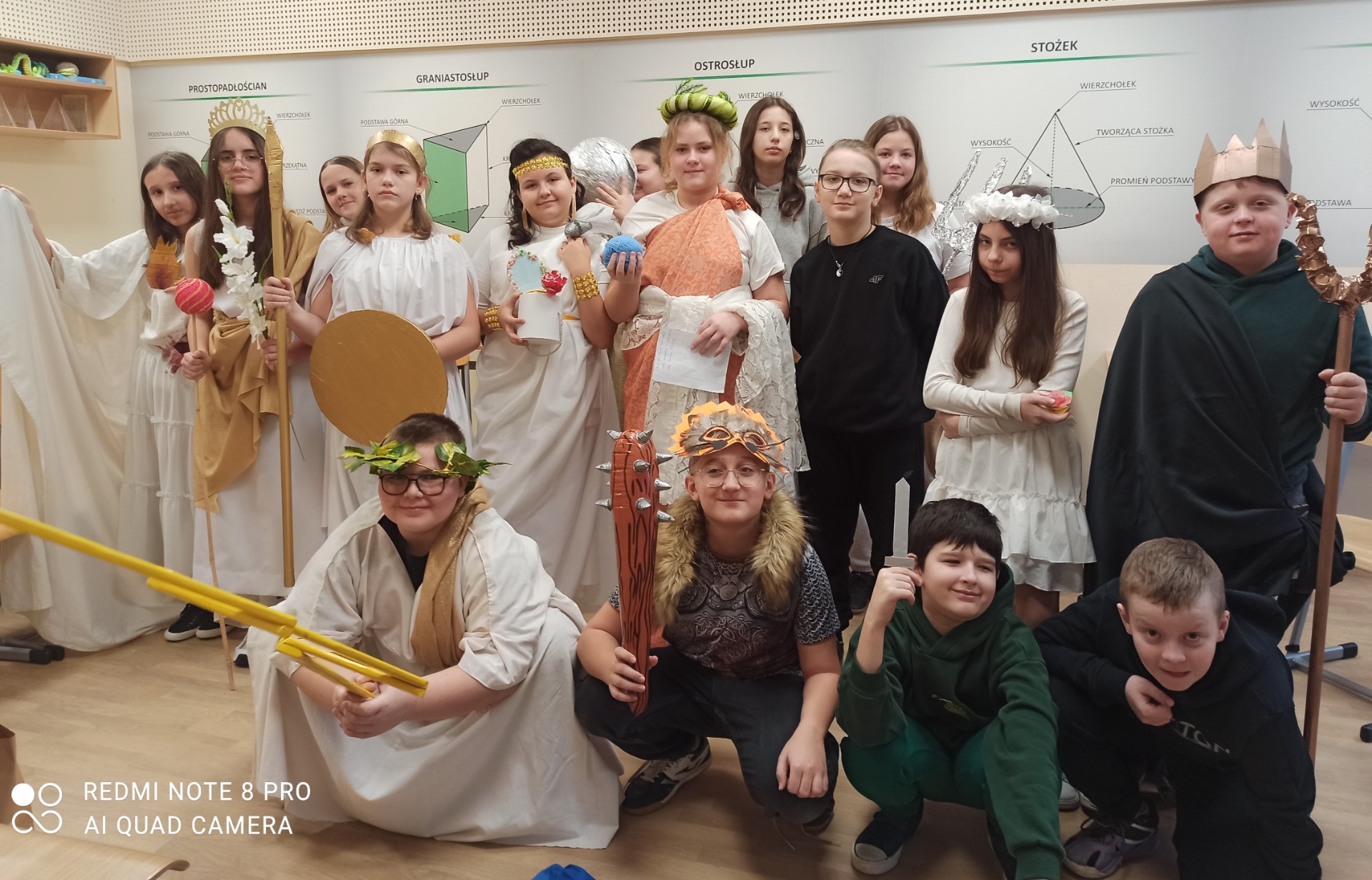 W styczniu szkolna sala na chwilę zamieniła się w mitologiczny Olimp. Uczniowie klasy 5, w ramach powtórzenia wiadomości o mitologii greckiej, wcielili się w postacie bogów i bogiń. Przygotowując się do zajęć, dzieci samodzielnie oraz przy wsparciu rodziców wykonały charakterystyczne atrybuty swoich bohaterów. Podczas lekcji prezentowały wybrane postacie, opowiadały o ich roli w mitologii oraz dzieliły się wyszukanymi ciekawostkami.